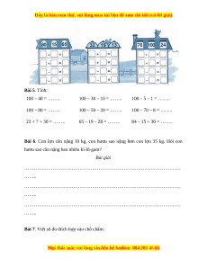 Bài 5. Tính: 100 – 40 = …….. 100 – 30 – 10 = …….. 100 – 5 – 1 = …….. 100 – 80 = …….. 100 – 50 – 20 = …….. 100 – 70 – 8 = …….. 23 + 7 + 30 = …….. 65 – 19 – 28 = …….. 84 – 15 + 30 = ……..