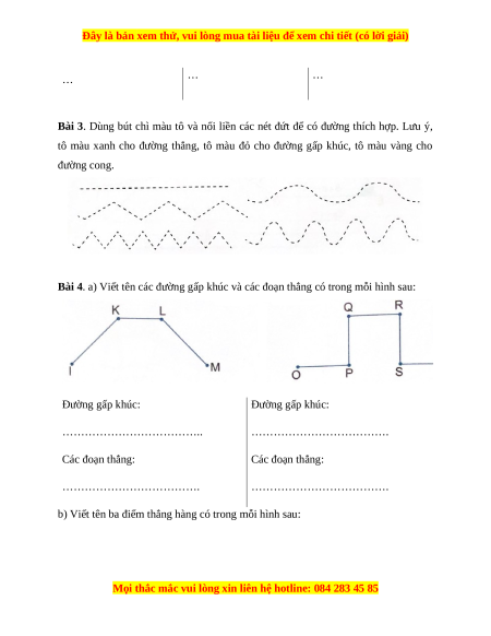 tô màu xanh cho đường thẳng, tô màu đỏ cho đường gấp khúc, tô màu vàng cho đường cong.