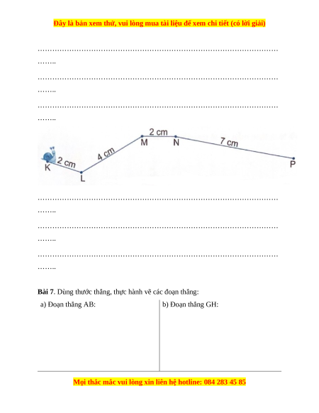 Bài 7. Dùng thước thẳng, thực hành vẽ các đoạn thẳng: a) Đoạn thẳng AB: b) Đoạn thẳng GH: