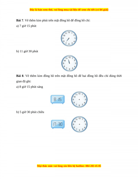 Bài 8. Vẽ thêm kim đồng hồ trên mặt đồng hồ để hai đồng hồ đều chỉ đúng thời gian đã ghi: a) 8 giờ 15 phút sáng b) 5 giờ 30 phút chiều