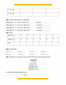 Phép nhân 8 × 5 = 40 có các thừa số là ………… và tích là …………… Bài 5. Số? Thừa số 2 2 2 2 2 2 2 Thừa số 2 3 6 1 4 8 7 Tích Bài 6. Tính nhẩm 2 × 1 = …. 2 × 3 = ….. 2 × 2 = …… 2 × 5 = …… 2 × 4 = …. 2 × 8 = ….. 2 × 6 = …… 2 × 9 = ……