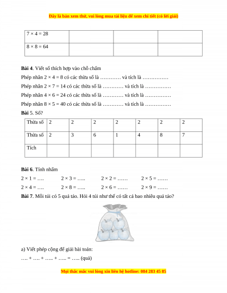 Bài 7. Mỗi túi có 5 quả táo. Hỏi 4 túi như thế có tất cả bao nhiêu quả táo?