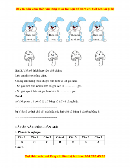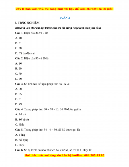 Câu 1. Hiệu của 36 và 5 là: A. 40 B. 31 C. 30 D. Cả ba đều sai