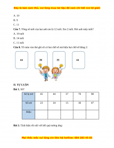 Câu 7. Tổng số tuổi của hai anh em là 12 tuổi. Em 2 tuổi. Hỏi anh mấy tuổi? A. 10 tuổi B. 14 tuổi C. 11 tuổi