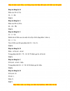 Đáp án đúng là: B Hiệu của 36 và 5 là: 36 – 5 = 31. Câu 2. Đáp án đúng là: C Hiệu của 90 và 20 là: 90 – 20 = 70. Câu 3. Đáp án đúng là: C 55 – 5 = 50.