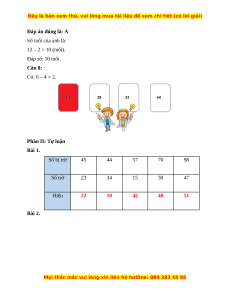 Câu 8. Tô màu vào thẻ ghi số có hai chữ số mà hiệu hai chữ số bằng 2: II. TỰ LUẬN Bài 1. Số? Số bị trừ 45 44 57 70 98 Số trừ 23 34 15 30 47 Hiệu