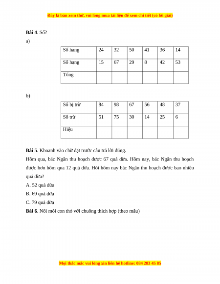 Bài 4. Số? a) Số hạng 24 32 50 41 36 14 Số hạng 15 67 29 8 42 53 Tổng b) Số bị trừ 84 98 67 56 48 37 Số trừ 51 75 30 14 25 6 Hiệu
