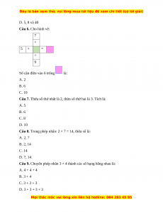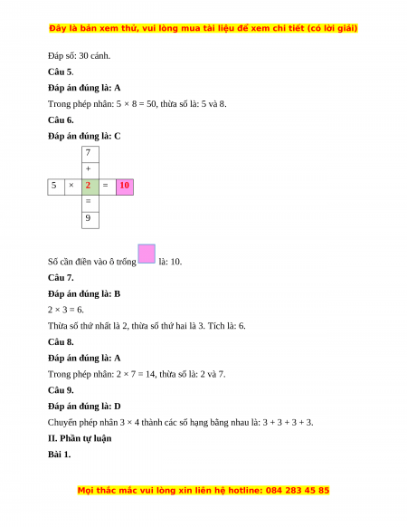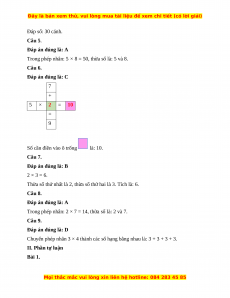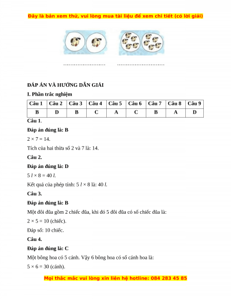 I. Phần trắc nghiệm Câu 1 Câu 2 Câu 3 Câu 4 Câu 5 Câu 6 Câu 7 Câu 8 Câu 9 B D B C A C B A D Câu 1. Đáp án đúng là: B 2 × 7 = 14.