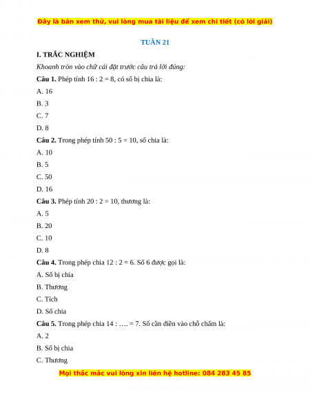 Câu 1. Phép tính 16 : 2 = 8, có số bị chia là: A. 16 B. 3 C. 7 D. 8