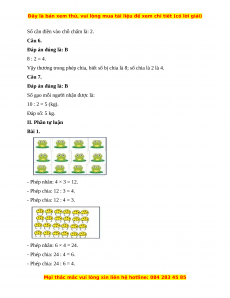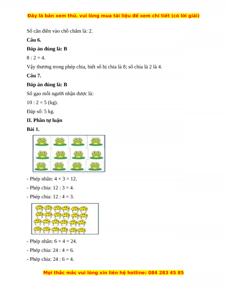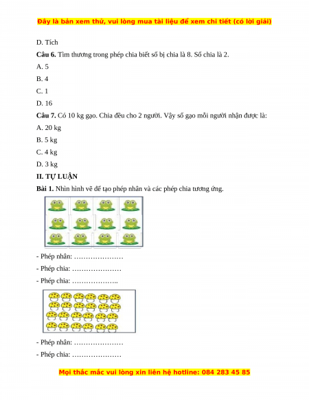 Câu 7. Có 10 kg gạo. Chia đều cho 2 người. Vậy số gạo mỗi người nhận được là: A. 20 kg B. 5 kg C. 4 kg D. 3 kg II. TỰ LUẬN