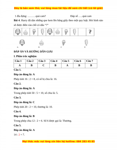 Câu 6. Tìm thương trong phép chia biết số bị chia là 8. Số chia là 2. A. 5 B. 4 C. 1 D. 16
