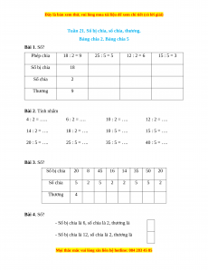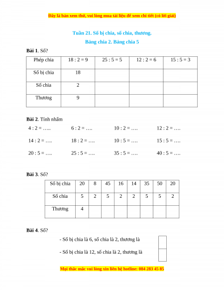 Bảng chia 2. Bảng chia 5 Bài 1. Số? Phép chia 18 : 2 = 9 25 : 5 = 5 12 : 2 = 6 15 : 5 = 3 Số bị chia 18 Số chia 2 Thương 9 Bài 2. Tính nhẩm 4 : 2 = ….. 6 : 2 = …. 10 : 2 = …. 12 : 2 = …. 14 : 2 = …. 18 : 2 = …. 10 : 5 = …. 15 : 5 = …. 20 : 5 = …. 25 : 5 = …. 35 : 5 = …. 40 : 5 = …. Bài 3. Số? Số bị chia 20 8 45 16 14 35 50 20 Số chia 5 2 5 2 2 5 5 2 Thương 4 Bài 4. Số?