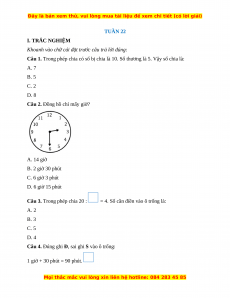 Kim ngắn ở khoảng giữa số 2 và số 3. Kim dài chỉ số 6. Vậy đồng hồ chỉ 2 giờ 30 phút. Câu 3. Đáp án đúng là: C 5 20 :