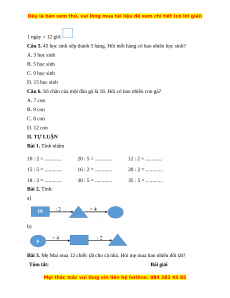 Câu 6. Số chân của một đàn gà là 18. Hỏi có bao nhiêu con gà? A. 7 con B. 9 con C. 8 con D. 12 con II. TỰ LUẬN Bài 1. Tính nhẩm 10 : 2 = ............. 20 : 5 = ............. 12 : 2 = ............. 15 : 5 = ............. 16 : 2 = ............. 20 : 2 = ............. 18 : 2 = ............. 30 : 5 = ............. 35 : 5 = ............. Bài 2. Tính: a) b)