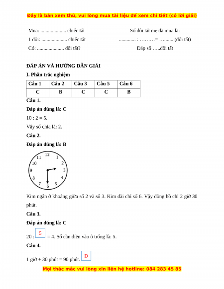 I. Phần trắc nghiệm Câu 1 Câu 2 Câu 3 Câu 5 Câu 6 C B C C B Câu 1. Đáp án đúng là: C 10 : 2 = 5. Vậy số chia là: 2. Câu 2. Đáp án đúng là: B