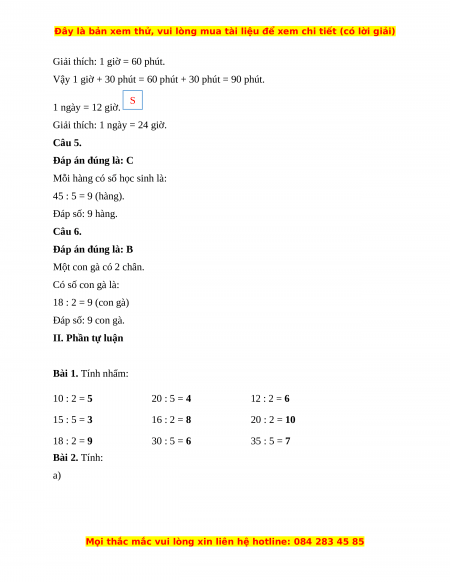 Mỗi hàng có số học sinh là: 45 : 5 = 9 (hàng). Đáp số: 9 hàng. Câu 6. Đáp án đúng là: B Một con gà có 2 chân. Có số con gà là: 18 : 2 = 9 (con gà) Đáp số: 9 con gà. II. Phần tự luận Bài 1. Tính nhẩm: 10 : 2 = 5 20 : 5 = 4 12 : 2 = 6 15 : 5 = 3 16 : 2 = 8 20 : 2 = 10 18 : 2 = 9 30 : 5 = 6 35 : 5 = 7 Bài 2. Tính: a)
