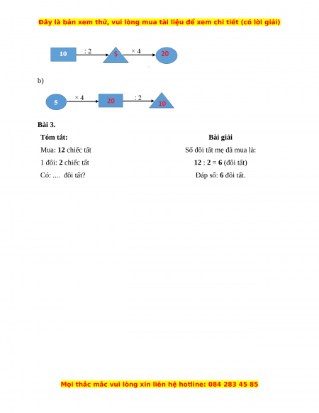 Bài 3. Mẹ Mai mua 12 chiếc tất cho cả nhà. Hỏi mẹ mua bao nhiêu đôi tất? Tóm tắt: Bài giải