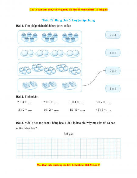 Bài 3. Mỗi lọ hoa mẹ cắm 5 bông hoa. Hỏi 3 lọ hoa như vậy mẹ cắm tất cả bao
