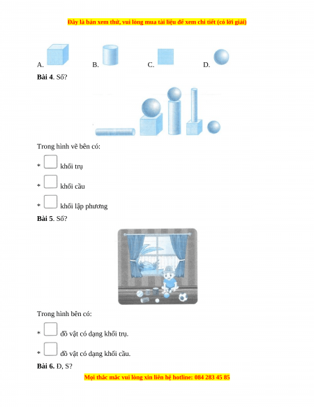 A. B. C. D. Bài 4. Số? Trong hình vẽ bên có: * khối trụ * khối cầu * khối lập phương Bài 5. Số? Trong hình bên có: *