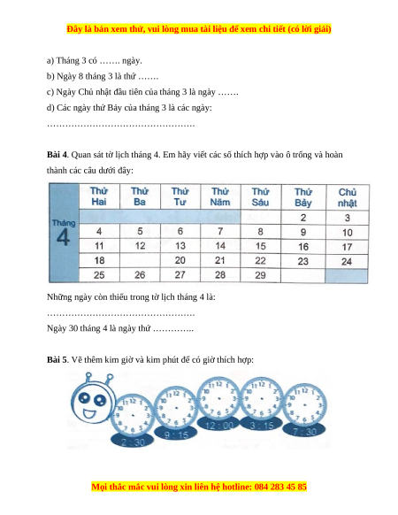 Bài 3. Quan sát tờ lịch tháng 3. Em hãy hoàn thành các câu dưới đây bằng cách