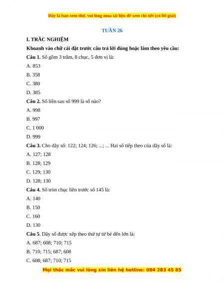 Câu 2. Số liền sau số 999 là số nào? A. 998 B. 997 C. 1 000 D. 999