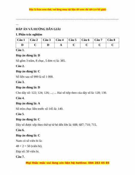Số liền sau số 999 là số 1 000. Câu 3. Đáp án đúng là: D