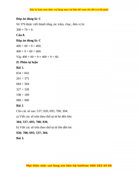 Câu 7. Số 379 được viết thành tổng các trăm, chục, đơn vị là: A. 300 + 7 B. 370 + 9 C. 300 + 70 + 9 D. 30 + 7 + 9