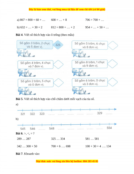 Bài 5. Viết số thích hợp vào chỗ chấm dưới mỗi vạch của tia số. a) b) Bài 6. >, <, = ? 289 … 287 325 … 334 581 … 581 342 … 300 + 50 700 + 6 …. 698 100 + 30 + 4 …. 134 Bài 7. Khoanh vào:
