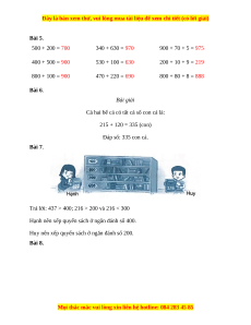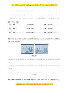 ……………….. ……………….. ……………….. ……………….. ……………….. ……………….. ……………….. ……………….. ……………….. ……………….. ……………….. ……………….. Bài 5. Tính nhẩm: 500 + 200 = ………… 340 + 630 = ………… 900 + 70 + 5 = ………… 400 + 500 = ………… 530 + 100 = ………… 200 + 10 + 9 = ………… 800 + 100 = ………… 470 + 220 = ………… 800 + 80 + 8 = …………