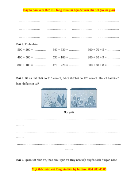 Bài 6. Bể cá thứ nhất có 215 con cá, bể cá thứ hai có 120 con cá. Hỏi cả hai bể có bao nhiêu con cá? Bài giải