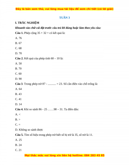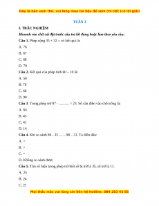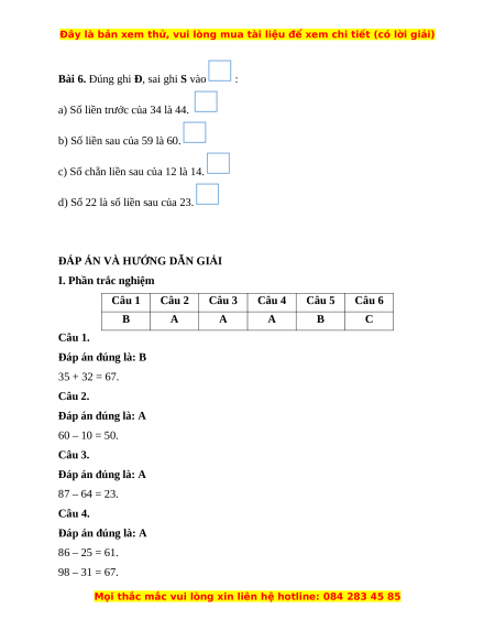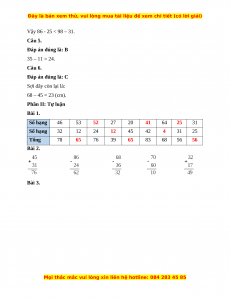 I. Phần trắc nghiệm Câu 1 Câu 2 Câu 3 Câu 4 Câu 5 Câu 6 B A A A B C Câu 1. Đáp án đúng là: B 35 + 32 = 67. Câu 2. Đáp án đúng là: A 60 – 10 = 50. Câu 3. Đáp án đúng là: A 87 – 64 = 23. Câu 4. Đáp án đúng là: A 86 – 25 = 61. 98 – 31 = 67.