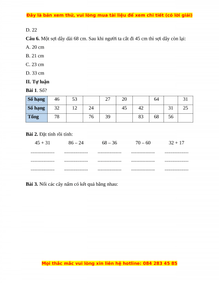 Câu 6. Một sợi dây dài 68 cm. Sau khi người ta cắt đi 45 cm thì sợi dây còn lại: A. 20 cm B. 21 cm C. 23 cm D. 33 cm II. Tự luận Bài 1. Số? Số hạng 46 53 27 20 64 31 Số hạng 32 12 24 45 42 31 25 Tổng 78 76 39 83 68 56