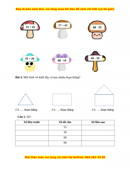 Bài 4. Mỗi hình vẽ dưới đây có bao nhiêu đoạn thẳng? Câu 5. Số? Số liền trước Số đã cho Số liền sau 55 36 69 99