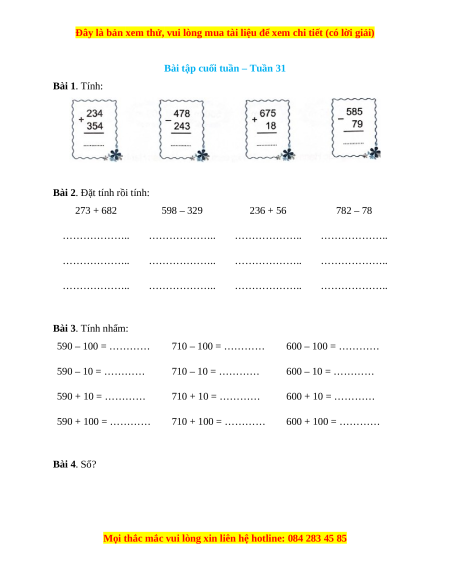 Bài 2. Đặt tính rồi tính: 273 + 682 598 – 329 236 + 56 782 – 78 ……………….. ……………….. ……………….. ……………….. ……………….. ……………….. ……………….. ……………….. ……………….. ……………….. ……………….. ……………….. Bài 3. Tính nhẩm: 590 – 100 = ………… 710 – 100 = ………… 600 – 100 = ………… 590 – 10 = ………… 710 – 10 = ………… 600 – 10 = ………… 590 + 10 = ………… 710 + 10 = ………… 600 + 10 = ………… 590 + 100 = ………… 710 + 100 = ………… 600 + 100 = ………… Bài 4. Số?