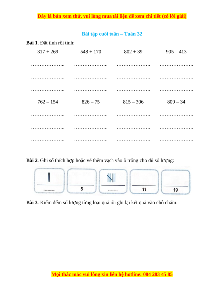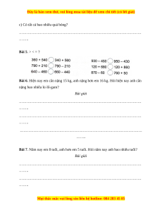 Bài 1. Đặt tính rồi tính: 317 + 269 548 + 170 802 + 39 905 – 413 ……………….. ……………….. ……………….. ……………….. ……………….. ……………….. ……………….. ……………….. ……………….. ……………….. ……………….. ……………….. 762 – 154 826 – 75 815 – 306 809 – 34 ……………….. ……………….. ……………….. ……………….. ……………….. ……………….. ……………….. ……………….. ……………….. ……………….. ……………….. ………………..