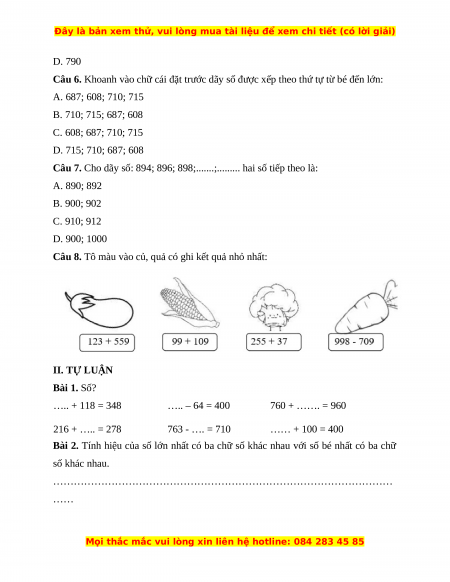 Câu 8. Tô màu vào củ, quả có ghi kết quả nhỏ nhất: II. TỰ LUẬN Bài 1. Số? ….. + 118 = 348 ….. – 64 = 400 760 + ……. = 960 216 + ….. = 278 763 - …. = 710 …… + 100 = 400