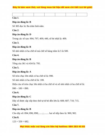 Số 305 đọc là: Ba trăm linh năm. Câu 2: Đáp án đúng là: D