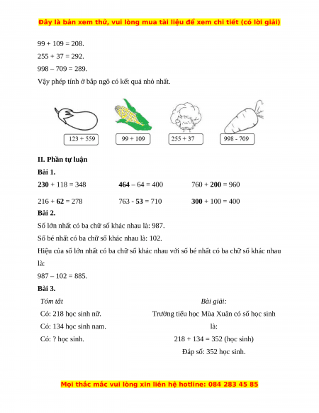 Bài 3. Trường Tiểu học Mùa Xuân có 218 học sinh nữ và 134 học sinh nam. Hỏi