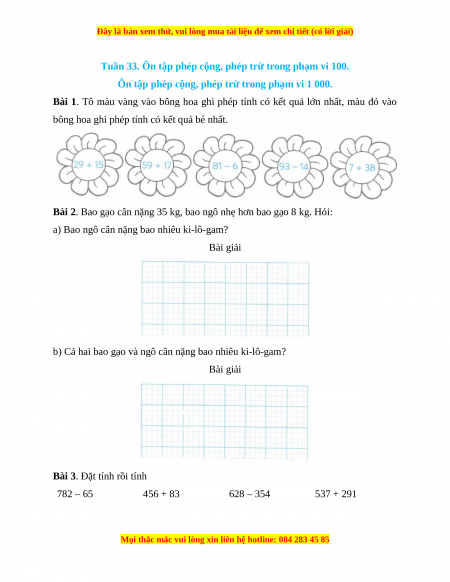 Tuần 33. Ôn tập phép cộng, phép trừ trong phạm vi 100.