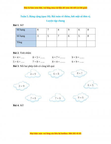 Tuần 5. Bảng cộng (qua 10). Bài toán về thêm, bớt một số đơn vị.
