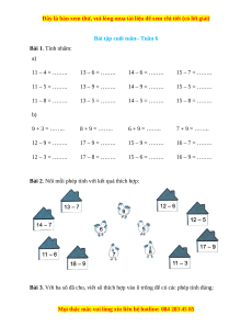 Bài tập cuối tuần– Tuần 6 Bài 1. Tính nhẩm: a) 11 – 4 = …….. 13 – 6 = …….. 14 – 6 = …….. 15 – 7 = …….. 11 – 5 = …….. 13 – 9 = …….. 14 – 9 = …….. 15 – 5 = …….. 11 – 8 = …….. 13 – 5 = …….. 14 – 5 = …….. 15 – 8 = …….. b) 9 + 3 = …….. 8 + 9 = …….. 6 + 9 = …….. 7 + 9 = …….. 12 – 9 = …….. 17 – 9 = …….. 15 – 9 = …….. 16 – 7 = …….. 12 – 3 = …….. 17 – 8 = …….. 15 – 6 = …….. 16 – 9 = ……..