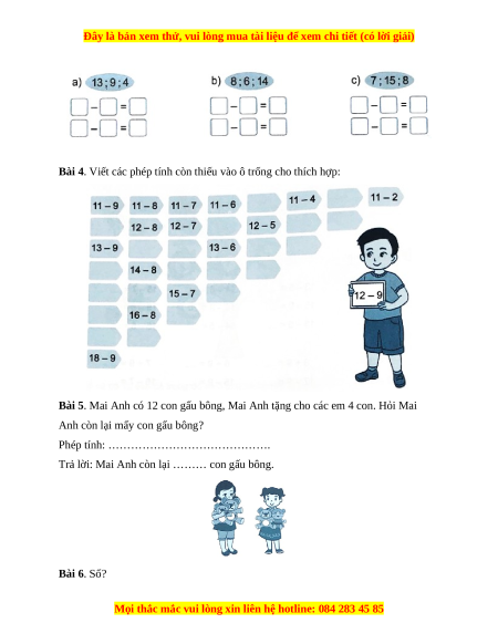 Bài 5. Mai Anh có 12 con gấu bông, Mai Anh tặng cho các em 4 con. Hỏi Mai
