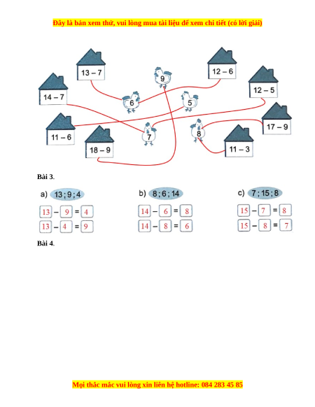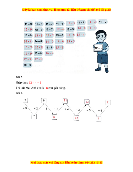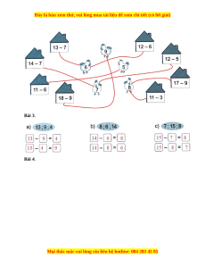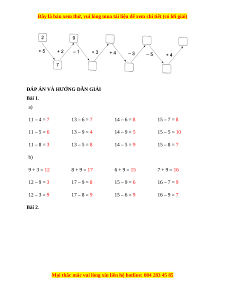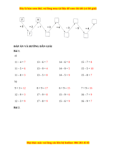 ĐÁP ÁN VÀ HƯỚNG DẪN GIẢI Bài 1. a) 11 – 4 = 7 13 – 6 = 7 14 – 6 = 8 15 – 7 = 8 11 – 5 = 6 13 – 9 = 4 14 – 9 = 5 15 – 5 = 10 11 – 8 = 3 13 – 5 = 8 14 – 5 = 9 15 – 8 = 7 b) 9 + 3 = 12 8 + 9 = 17 6 + 9 = 15 7 + 9 = 16 12 – 9 = 3 17 – 9 = 8 15 – 9 = 6 16 – 7 = 9 12 – 3 = 9 17 – 8 = 9 15 – 6 = 9 16 – 9 = 7 Bài 2.