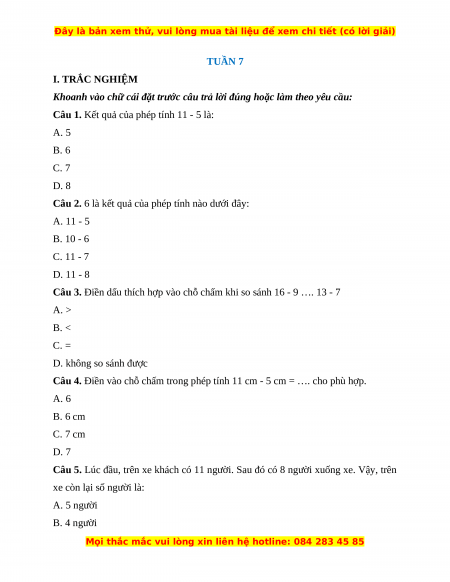Câu 1. Kết quả của phép tính 11 - 5 là: A. 5 B. 6 C. 7 D. 8