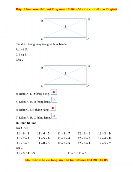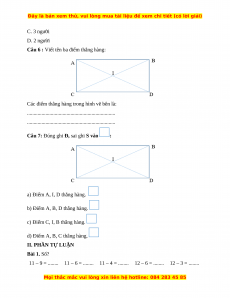 d) Điểm A, B, C thẳng hàng. II. PHẦN TỰ LUẬN Bài 1. Số? 11 – 9 = ........ 11 – 6 = ........ 11 – 4 = ........ 12 – 6 = ........ 12 – 3 = ........