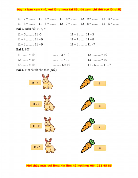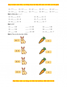 Bài 2. Điền dấu >, <, = 11 – 6 .......... 11 -5 11 – 8 ........ 11 – 5 11 – 4 .......... 11 – 9 11 – 7 ........ 11 – 8 11 – 8 .......... 11 – 9 11 – 6 .......... 11 - 7 Bài 3. Số? 11 - ..... = 10 ....... – 3 = 10 12 - ......... = 10 12 - ...... = 10 ....... – 1 = 10 14 - ......... = 10 17 - ...... = 10 ........ – 6 = 10 11 – 6 ........ 11 - 7