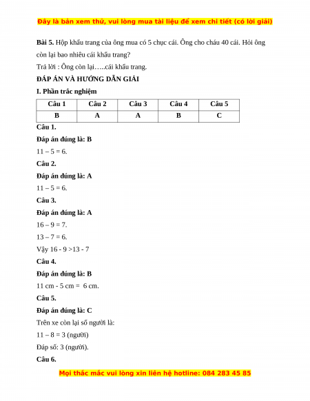 I. Phần trắc nghiệm Câu 1 Câu 2 Câu 3 Câu 4 Câu 5 B A A B C Câu 1. Đáp án đúng là: B 11 – 5 = 6. Câu 2. Đáp án đúng là: A 11 – 5 = 6. Câu 3. Đáp án đúng là: A 16 – 9 = 7. 13 – 7 = 6. Vậy 16 - 9 >13 - 7 Câu 4. Đáp án đúng là: B 11 cm - 5 cm = 6 cm. Câu 5. Đáp án đúng là: C
