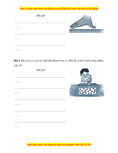 Bài 4. Bể cá có 21 con cá, Tâm thả thêm 8 con cá. Hỏi bể cá đó có tất cả bao nhiêu con cá? Bài giải
