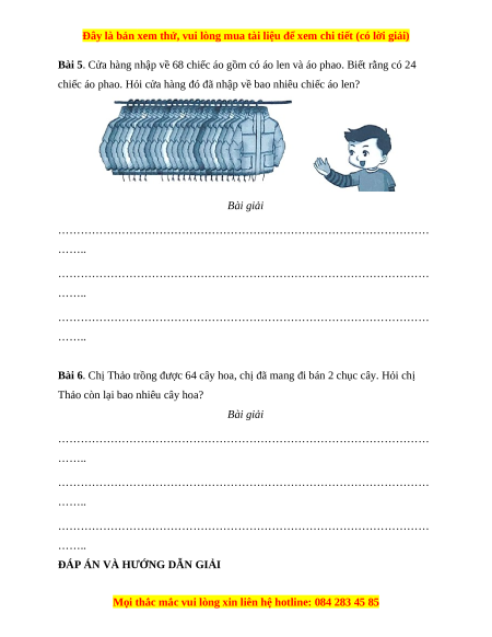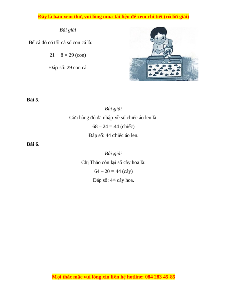 Bài 6. Chị Thảo trồng được 64 cây hoa, chị đã mang đi bán 2 chục cây. Hỏi chị