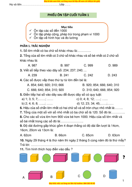 PHIẾU ÔN TẬP CUỐI TUẦN 1 Mục tiêu